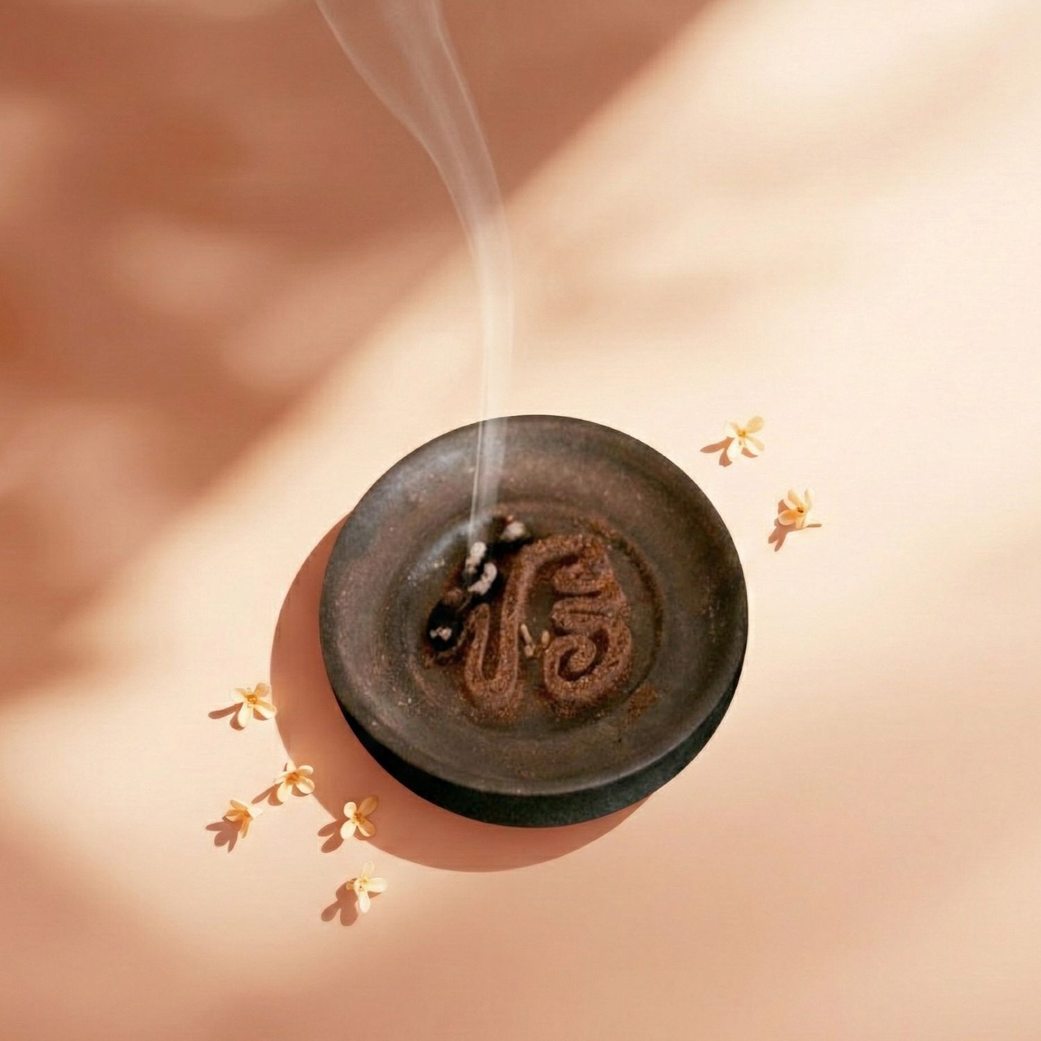 請將薰香粉酌量置入薰香盤中,再使用點火器或火柴點燃薰香粉即可。